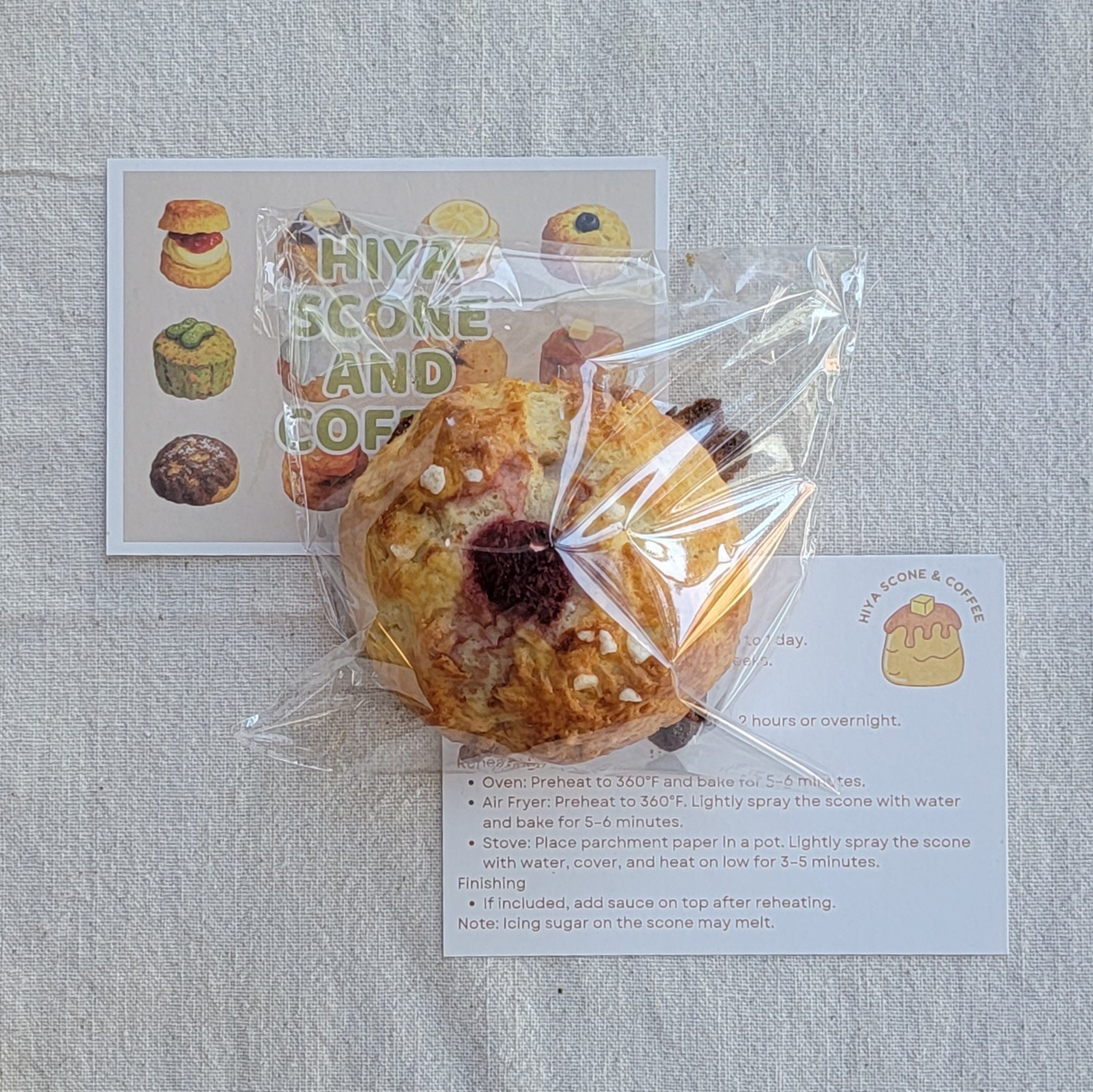 This scone is filled with fresh raspberries and white chocolate chips, then topped with crunchy pearl sugar. It has a delicate balance of sweet and tangy flavors.